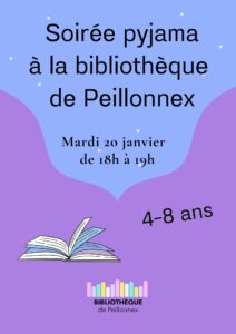 SOIREE PYJAMA BIBLIOTHEQUE DE PEILLONNEX 8 janvier 2026 SOIREE PYJAMA BIBLIOTHEQUE DE PEILLONNEX MARDI 20 JANVIER 2026 DE 18H A 19H 4-8 ANS
